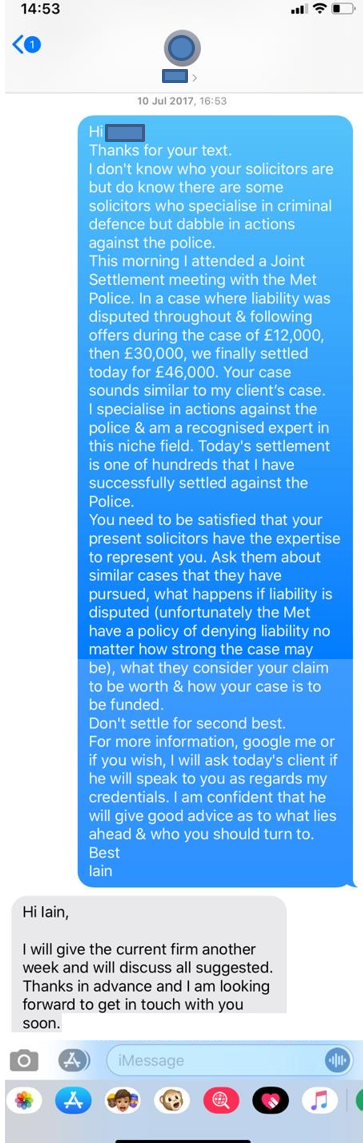 I was in London at the time and suggested he call me in the morning. Later that same day, he replied advising that he had decided to carry on with the same firm that had represented him in the Magistrates’ Court. You can see our text messages below: