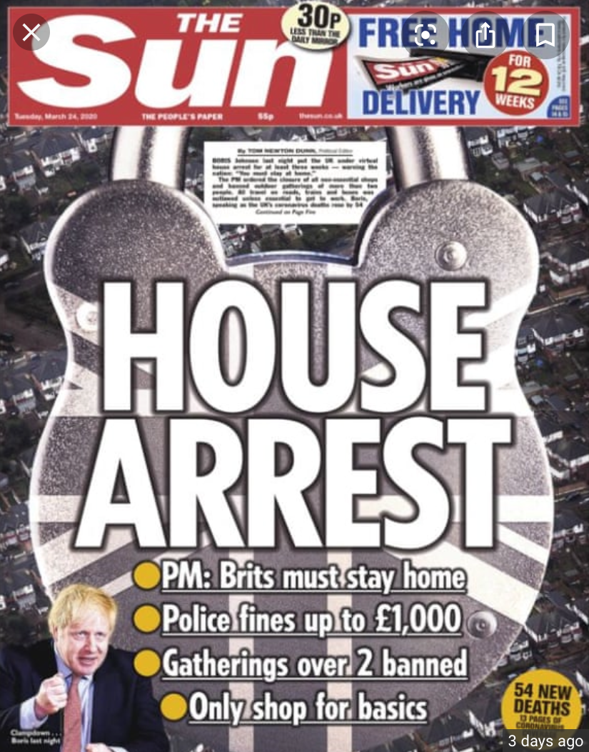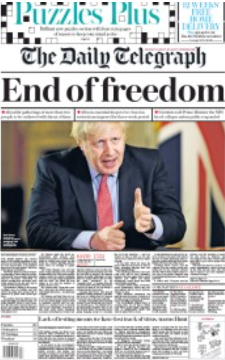 Last night’s headlines confirm that the UK’s Coronovirus “lockdown” is to continue and reminded me of the dramatic headlines of 3 weeks ago; the “End of Freedom” according to The Daily Telegraph while the Sun had a picture of a giant padlock on its front page with the headline, “House Arrest”.