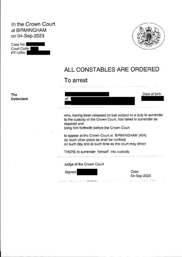 - An arrest in compliance with a Court Order, such as a Crown Court Warrant. See below an image of such a Warrant (with my client’s personal details redacted).