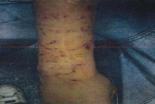 Luke’s arm (shown below after the wounds had been cleaned) was bleeding heavily but the police insisted on searching him before getting medical help.